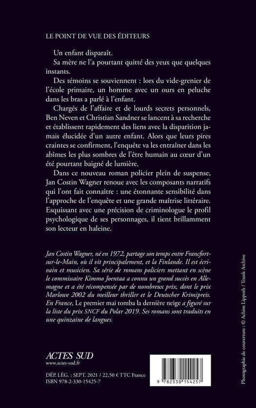 Un enfant disparaît. Sa mère ne l'a pourtant quitté des yeux que quelques instants. Des témoins se souviennent : lors du vide-grenier de l'école primaire, un homme avec un ours en peluche dans les bras a parlé à l'enfant. Chargés de l'affaire et de lourds secrets personnels, Ben Neven et Christian Sandner se lancent à sa recherche et établissent rapidement des liens avec la disparition jamais élucidée d'un autre enfant. Alors que leurs pires craintes se confirment, l'enquête va les entraîner dans les abîmes les plus sombres de l'être humain au coeur d'un été pourtant baigné de lumière. Dans ce nouveau roman policier plein de suspense, Jan Costin Wagner renoue avec les composants narratifs qui l'ont fait connaître : une étonnante sensibilité dans l'approche de l'enquête et une grande maîtrise littéraire. Esquissant avec une précision de criminologue le profil psychologique de ses personnages, il tient brillamment son lecteur en haleine.