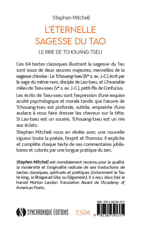 Le Tchouang-tseu (Ive siècle av. J.-C.) écrit par le sage du même nom, disciple de Lao-tseu, et l'Invariable milieu de Tseu-sseu (Ve siècle av. J.-C.), petit-fils de Confucius, sont deux merveilles de la sagesse chinoise. L'œuvre de Tchouang-tseu est profonde, subtile, empreinte d'une audace à vous faire dresser les cheveux sur la tête. Si Lao-tseu est un sourire, Tchouang-tseu est un rire aux éclats. Quant aux textes de Tseu-sseu, ils sont l'expression d'une exquise acuité psychologique et morale. Stephen Mitchell en a choisi les passages les plus clairs et les plus vibrants. Il nous révèle avec une nouvelle vigueur toute la poésie, l'esprit et l'humour de ces textes classiques. Ses commentaires jubilatoires et colorés par une longue pratique du zen explicitent et complètent chaque texte.