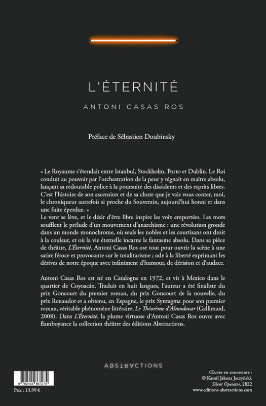 Le vent se lève, et le désir d'être libre inspire les voix emportées. Les mots soufflent le prélude d'un mouvement d'anarchisme : une révolution gronde dans un monde monochrome, où seuls les nobles et les courtisans ont droit à la couleur, et où la vie éternelle incarne le fantasme absolu. Dans sa pièce de théâtre, L'Éternité, Antoni Casas Ros ose tout pour ouvrir la scène à une satire féroce et provocante sur le totalitarisme ; ode à la liberté exprimant les dérives de notre époque avec infiniment d'humour, de dérision et d'audace.