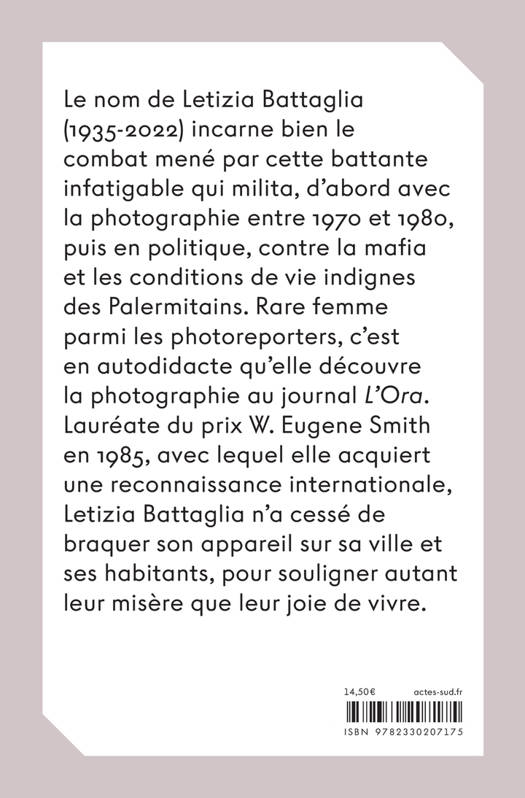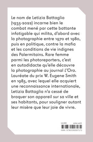 Letizia Battaglia (1935-2022) aurait dû mourir cent fois sous les balles des mafiosi, dont elle a avec obstination documenté les exactions, en particulier lorsque le clan des Corleonesi a multiplié les assassinats, faisant plus de mille morts à Palerme au début des années 1980. Rare femme parmi les photoreporters, c'est en autodidacte qu'elle découvre la photographie au journal L'Ora, un quotidien palermitain communiste. En 1985, elle gagne le prix de photojournalisme W. Eugene Smith et c'est le début d'une reconnaissance internationale.