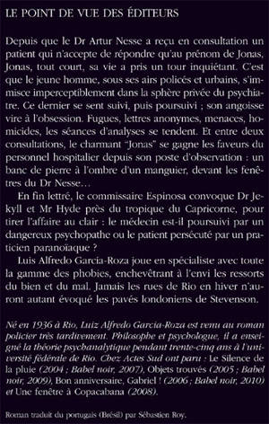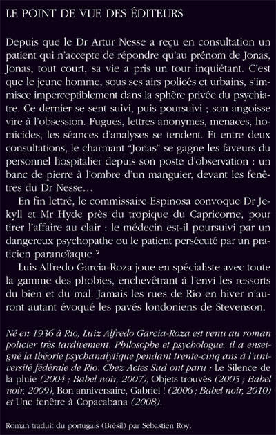 Depuis que le Dr Artur Nesse a reçu en consultation un patient qui n'accepte de répondre qu'au prénom de Jonas, Jonas, tout court, sa vie a pris un tour inquiétant. C'est que le jeune homme, sous ses airs policés et urbains, s'immisce imperceptiblement dans la sphère privée du psychiatre. Ce dernier se sent suivi, puis poursuivi ; son angoisse vire à l'obsession. Fugues, lettres anonymes, menaces, homicides, les séances d'analyses se tendent. En fin lettré, le commissaire Espinosa convoque Dr Jekyll et Mr Hyde près du tropique du Capricorne, pour tirer l'affaire au clair : le médecin est-il poursuivi par un dangereux psychopathe ou le patient persécuté par un praticien paranoïaque ? Luis Alfredo Garcia-Roza joue en spécialiste avec toute la gamme des phobies, enchevêtrant à l'envi les ressorts du bien et du mal. Jamais les rues de Rio en hiver n'auront autant évoqué les pavés londoniens de Stevenson.