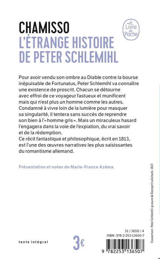 Pour avoir vendu son ombre au Diable contre la bourse inépuisable de Fortunatus, Peter Schlemihl va connaître une existence de proscrit. Chacun se détourne avec effroi de ce voyageur fastueux et munificent mais qui n’est plus un homme comme les autres. Condamné à vivre loin de la lumière pour masquer sa singularité, il tentera sans succès de reprendre son bien à l’Homme Gris. Mais un miraculeux hasard l’engagera dans la voie de l’expiation, du vrai savoir et de la rédemption. Ce récit fantastique et philosophique, écrit en 1813, est l’une des œuvres narratives les plus saisissantes du romantisme allemand. Il est à l’origine d’un mythe moderne dont on n’a pas encore épuisé la richesse.