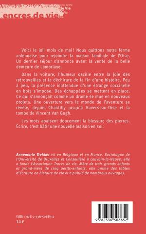 Voici le joli mois de mai ! Nous quittons notre ferme ardennaise pour rejoindre la maison familiale de l'Oise. Un dernier séjour s'annonce avant la vente de la belle demeure de Lamorlaye. Dans la voiture, l'humeur oscille entre la joie des retrouvailles et la déchirure de la fin d'une histoire. Peu à peu, la présence inattendue d'une étrange coccinelle en bois s'impose. Des échappées se mettent en place. Ce qui s'annonçait comme un drame se mue en nouveaux projets. Une ouverture vers le monde de l'aventure se révèle, depuis Chantilly jusqu'à Auvers-sur-Oise et la tombe de Vincent Van Gogh. Les mots apaisent doucement la blessure des pierres. Écrire, c'est bâtir une nouvelle maison en soi.