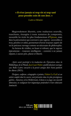 Il n'est jamais ni trop tot ni trop tard pour prendre soin de son ame.Lettre a Menecee Magistralement illustree, cette traduction nouvelle, tranchante, etrangere a toute tentation de compromis, rassemble les ecrits les plus fondamentaux d'Epicure, mais dans la presentation qui convient a une sagesse: accessibles a tous, proches et utiles, permettant d'avoir toujours aupres de soi le precieux ouvrage comme un necessaire de philosophie. Au lecteur de verifier, en lisant et relisant, que la sagesse epicurienne - toujours intelligente - consiste a ne jamais separer, a aucun prix, plaisir et liberte.
