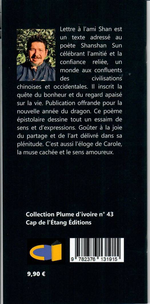 Lettre à l’ami Shan est un texte adressé au poète Shanshan Sun célébrant l’amitié et la confiance reliée, un monde aux confluents des civilisations chinoises et occidentales. Il inscrit la quête du bonheur et du regard apaisé sur la vie. Publication offrande pour la nouvelle année du dragon, ce poème épistolaire dessine tout un essaim de sens et d’expressions. Goûter à la joie du partage et de l’art délivré dans sa plénitude. C’est aussi l’éloge de Carole la muse cachée et le sens amoureux.