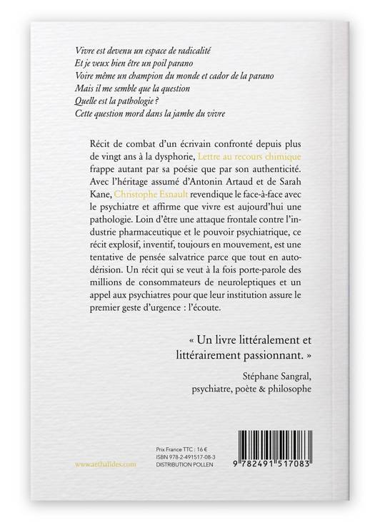 « Vivre est devenu un espace de radicalité » Récit de combat d'un écrivain confronté depuis plus de vingt ans à la dysphorie, "Lettre au recours chimique" frappe autant par sa poésie que par son authenticité. Avec l'héritage assumé d'Antonin Artaud et de Sarah Kane, Christophe Esnault revendique le face-à-face avec le psychiatre et affirme que vivre est aujourd'hui une pathologie. Loin d'être une attaque frontale contre l'industrie pharmaceutique et le pouvoir psychiatrique, ce récit explosif, inventif, toujours en mouvement est une tentative de pensée salvatrice parce que tout en autodérision. Un récit qui se veut à la fois porte-parole des millions de consommateurs de neuroleptiques et un appel aux psychiatres pour que leur institution assure le premier geste d'urgence : l'écoute. « Un livre littéralement et littérairement passionnant. », selon le psychiatre et poète Stéphane Sangral.