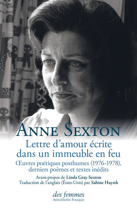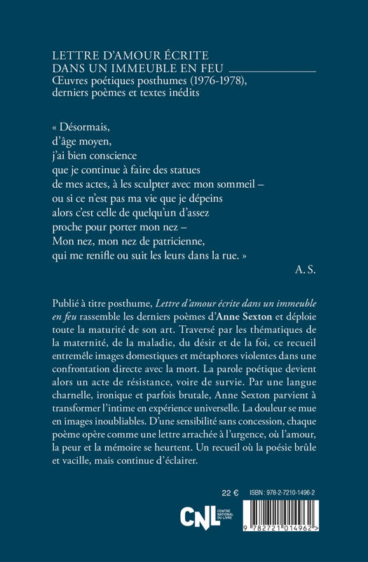 Publié à titre posthume, "Lettre d’amour écrite dans un immeuble en feu" rassemble les derniers poèmes d’Anne Sexton et déploie toute la maturité de son art. Traversé par les thématiques de la maternité, de la maladie, du désir et de la foi, ce recueil entremêle images domestiques et métaphores violentes dans une confrontation directe avec la mort. La parole poétique devient alors un acte de résistance, voire de survie. Par une langue charnelle, ironique et parfois brutale, Anne Sexton parvient à transformer l’intime en expérience universelle. La douleur se mue en images inoubliables. D’une sensibilité sans concession, chaque poème opère comme une lettre arrachée à l’urgence, où l’amour, la peur et la mémoire se heurtent. Un recueil où la poésie brûle et vacille, mais continue d’éclairer.