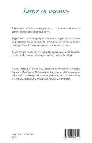 Faisant suite à Quatre saisons plus une, Lettre en vacance s'inscrit comme le deuxième volet de la quête. Regard assis, récoltant quelques images, cartes postales qui tentent de poursuivre vie en sortant de l'enveloppe. Enveloppe de papier, enveloppe de soi, fragile enveloppe...la mue est en cours. Volets fermés, volets ouverts selon les quatre vents de la chanson, en attente du dernier balcon qui viendra conclure la trilogie.
