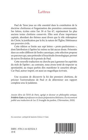 Paul de Tarse joua un rôle essentiel dans la constitution de la doctrine chrétienne et l'organisation des premières communautés. Ses lettres, écrites entre l'an 50 et l'an 67, représentent les plus anciens textes chrétiens conservés. Elles sont d'une importance capitale, abordant des thèmes aussi divers que le rôle rédempteur du Christ, la justification par la foi, la nature de l'Église, l'obéissance aux pouvoirs civils. Cette édition se limite aux sept lettres « proto-pauliniennes », dont l'attribution à l'apôtre lui-même ne fait aucun doute. Présentée dans un ordre différent de l'ordre canonique, cette sélection propose un parcours qui, sans prétendre à l'exactitude chronologique, permet de suivre l'évolution de la pensée de Paul. Cette nouvelle traduction ne cherche pas à gommer les aspérités du style de l'apôtre ; au contraire, nous avons tenté de respecter sa spontanéité, au risque parfois d'en manifester le caractère abrupt. Car Paul, auteur inspiré, est aussi un magnifique écrivain. Une occasion de découvrir la foi des premiers chrétiens, de préciser l'universalisme de Paul et de déterminer son rapport complexe avec le judaïsme.