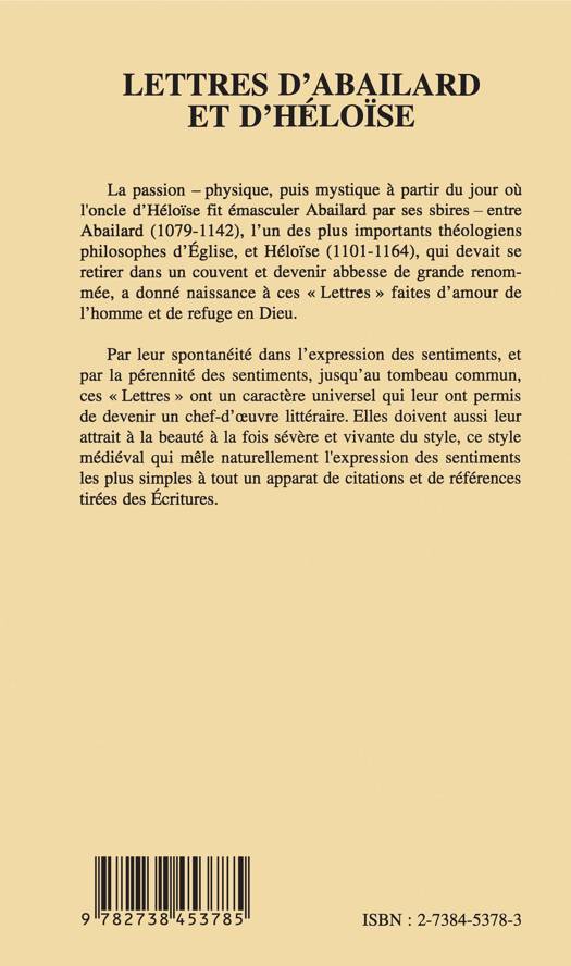 La passion entre Abailard, l'un des plus importants théologiens philosophes d'Église, et Héloïse, qui devait devenir abbesse de grande renommée, a donné naissance à ces Lettres faites d'amour de l'homme et de refuge en Dieu. Par leur spontanéité dans l'expression des sentiments et la pérennité des sentiments, ces "Lettres" ont acquis un caractère universel qui leur ont permis de devenir un chef-d'oeuvre littéraire.