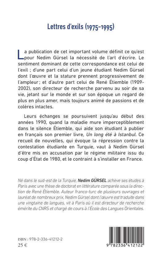 La publication de cet important volume définit ce qu’est pour Nedim Gürsel la nécessité de l’art d'écrire. Le sentiment dominant de cette correspondance est celui de l'exil ; d’une part celui d’un jeune étudiant Nedim Gürsel dont l’œuvre et la stature prennent progressivement de l’ampleur ; et d’autre part celui de René Étiemble (1909-2002), son directeur de recherche parvenu au soir de sa vie, jetant sur le monde et sur son époque un regard de plus en plus amer, mais toujours animé de passions et de colères intactes. Leurs échanges se poursuivent jusqu’au début des années 1990, quand la maladie mure imperceptiblement dans le silence Étiemble, qui aide son étudiant à publier en français son premier livre, Un long été à Istanbul. Ce recueil de nouvelles, qui évoque la répression contre la contestation étudiante en Turquie, vaut à Nedim Gürsel d’être mis en accusation par le régime militaire issu du coup d’État de 1980, et le contraint à s’installer en France.