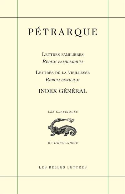 Cet index vient genereusement guider l'imposant massif de la correspondance de Petrarque, d'abord parue dans la collection Classiques de l'humanisme (en deux series, les Lettres de la vieillesse et les Lettres familieres, respectivement de 5 et 6 tomes chacune) et a present disponible, de maniere selective, dans la collection Editio Minor.