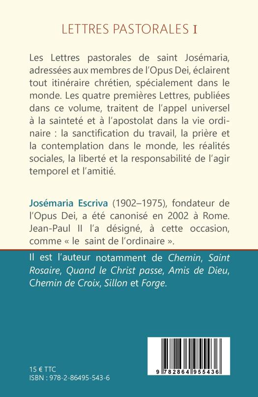 Les Lettres pastorales de saint Josémaria, adressées aux membres de l'Opus Dei, éclairent tout itinéraire chrétien, spécialement dans le monde. Les quatre premières Lettres, publiées dans ce volume, traitent de l'appel universel à la sainteté et à l'apostolat dans la vie ordinaire : la sanctification du travail, la prière et la contemplation dans le monde, les réalités sociales, la liberté et la responsabilité de l'agir temporel et l'amitié.