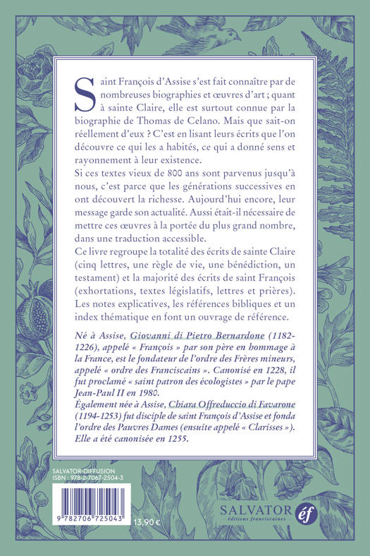 Saint François s'est fait connaître par de nombreuses biographies et Åuvres d'art, sainte Claire, dans son sillage, est aussi connue par la biographie qu'en a faite Thomas de Celano. Mais que sait-on réellement d'eux ? C'est en lisant leurs écrits que l'on découvre ce qui les a habités, ce qui a donné sens, dynamisme et rayonnement à leur existence. Si ces textes vieux de 800 ans sont parvenus jusqu'à nous, c'est parce que les générations qui nous les ont transmis en ont découvert la richesse. Aujourd'hui encore, leur message garde toute son actualité. Aussi était-il nécessaire de mettre à la portée du plus grand nombre ces écrits, dans une traduction simple (tout en étant fidèle au texte latin) et facile à comprendre directement par une génération qui ignore souvent le vocabulaire religieux ou n'en perçoit plus la plénitude de sens. Ce livre regroupe ainsi la totalité des écrits de sainte Claire et la majorité des écrits et la majorité des écrits de saint François.