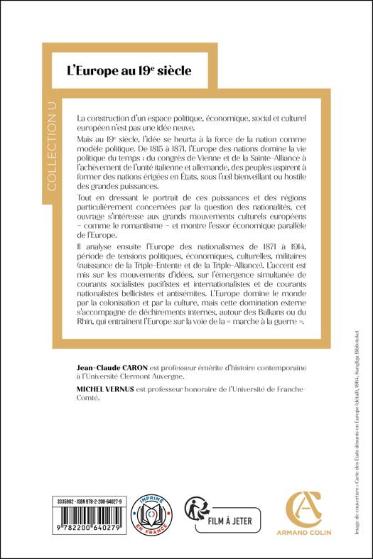 La construction d’un espace politique, économique, social et culturel européen n’est pas une idée neuve. Mais au 19e siècle, l’idée se heurta à la force de la nation comme modèle politique. De 1815 à 1871, l’Europe des nations domine la vie politique du temps : du congrès de Vienne et de la Sainte-Alliance à l’achèvement de l’unité italienne et allemande, des peuples aspirent à former des nations érigées en États, sous l’il bienveillant ou hostile des grandes puissances. Tout en dressant le portrait de ces puissances et des régions particulièrement concernées par la question des nationalités, cet ouvrage s’intéresse aux grands mouvements culturels européens – comme le romantisme – et montre l’essor économique parallèle de l’Europe. Il analyse ensuite l’Europe des nationalismes de 1871 à 1914, période de tensions politiques, économiques, culturelles, militaires (naissance de la Triple-Entente et de la Triple-Alliance). L’accent est mis sur les mouvements d’idées, sur l’émergence simultanée de courants socialistes pacifistes et internationalistes et de courants nationalistes bellicistes et antisémites. L’Europe domine le monde par la colonisation et par la culture, mais cette domination externe s’accompagne de déchirements internes, autour des Balkans ou du Rhin, qui entraînent l’Europe sur la voie de la « marche à la guerre ».