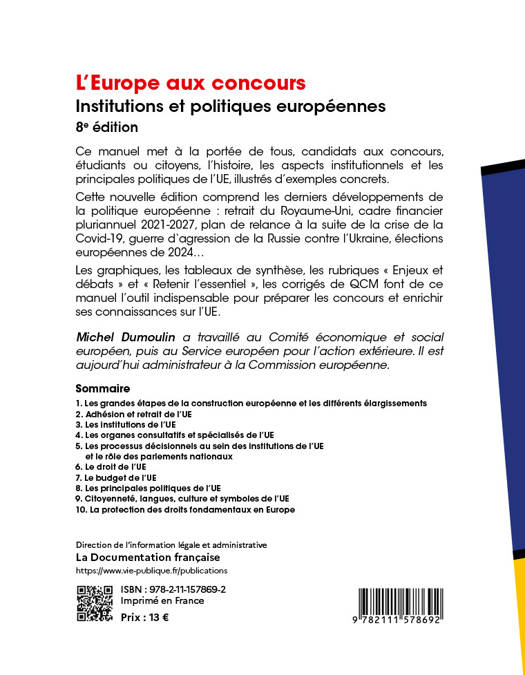 Les épreuves de connaissance sur l’Union européenne (UE) sont présentes dans plusieurs concours administratifs – instituts régionaux d’administration (IRA), Institut national du service public (INSP), secrétaire administratif, etc. –, et de nombreuses grandes écoles de management et de commerce. Plus largement, l’Europe est une problématique fréquemment abordée dans les dissertations générales de ces concours, ainsi que dans les examens de nombreuses filières universitaires, à l’oral comme à l’écrit. Ce manuel met à la portée de tous, candidats aux concours ou citoyens, l’histoire, les aspects institutionnels et les principales politiques de l’UE, illustrés d’exemples concrets. Cette nouvelle édition comprend les derniers développements de la politique européenne : retrait du Royaume-Uni, cadre financier pluriannuel 2021-2027, plan de relance suite à la crise de la Covid-19, guerre de la Russie contre l’Ukraine, élections européennes de 2024. Les graphiques, les tableaux de synthèse, les rubriques « Enjeux et débats » et « Retenir l’essentiel », les corrigés de QCM font de ce manuel l’outil indispensable pour préparer les concours et enrichir ses connaissances sur l’UE.