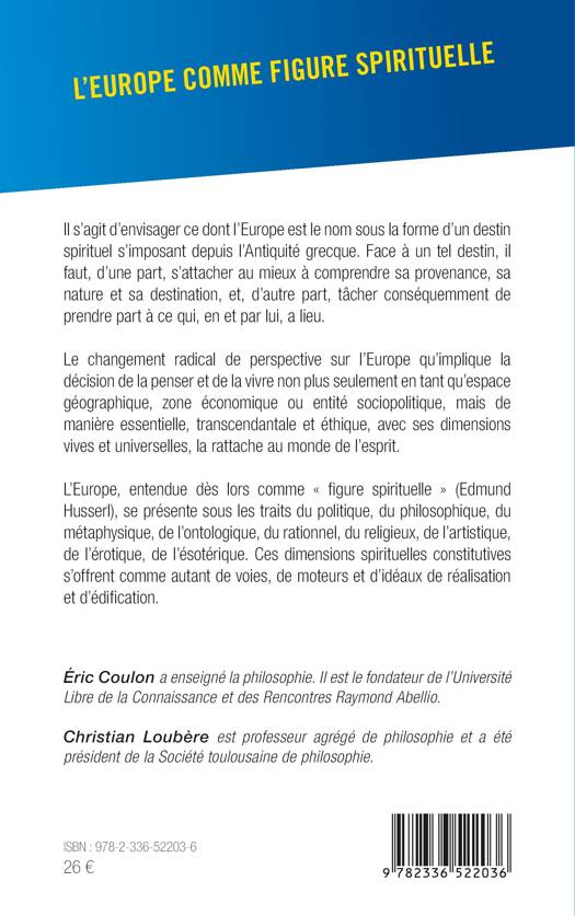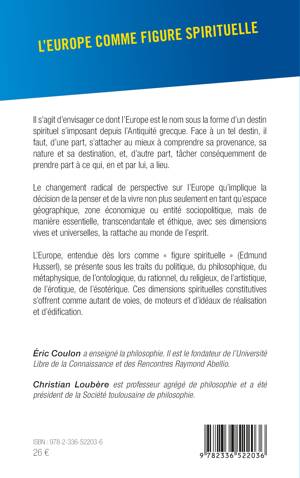Il s'agit d'envisager ce dont l'Europe est le nom sous la forme d'un destin spirituel s'imposant depuis l'Antiquité grecque. Face à un tel destin, il faut, d'une part, s'attacher au mieux à comprendre sa provenance, sa nature et sa destination, et, d'autre part, tâcher conséquemment de prendre part à ce qui, en et par lui, a lieu. Le changement radical de perspective sur l'Europe qu'implique la décision de la penser et de la vivre non plus seulement en tant qu'espace géographique, zone économique ou entité sociopolitique, mais de manière essentielle, transcendantale et éthique, avec ses dimensions vives et universelles, la rattache au monde de l'esprit. L'Europe, entendue dès lors comme figure spirituelle (Husserl), se présente sous les traits du politique, du philosophique, du métaphysique, de l'ontologique, du rationnel, du religieux, de l'artistique, de l'érotique, de l'ésotérique. Ces dimensions spirituelles constitutives s'offrent comme autant de voies, de moteurs et d'idéaux de réalisation et d'édification.