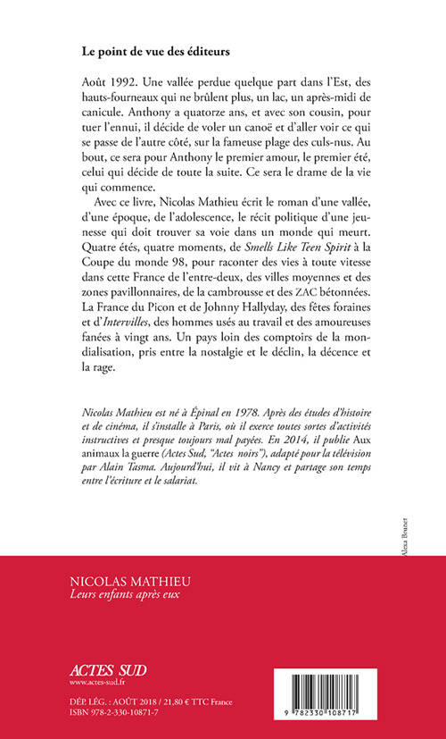 Avec ce livre, Nicolas Mathieu écrit le roman d'une vallée, d'une époque, de l'adolescence, le récit politique d'une jeunesse qui doit trouver sa voie dans un monde qui meurt. Quatre étés, quatre moments, de Smells Like Teen Spirit à la Coupe du monde 98, pour raconter des vies à toute vitesse dans cette France de l'entre- deux, des villes moyennes et des zones pavillonnaires, de la cambrousse et des ZAC bétonnées. La France du Picon et de Johnny Hallyday, des fêtes foraines et d'Intervilles, des hommes usés au travail et des amoureuses fanées à vingt ans. Un pays loin des comptoirs de la mondialisation, pris entre la nostalgie et le déclin, la décence et la rage.