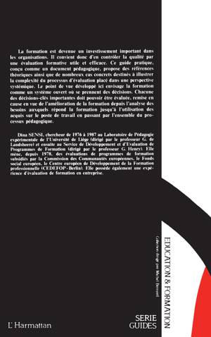 La formation est devenue un investissement important dasn les organisations. Il convient donc d'en contrôler la qualité par une évaluation formative utile et efficace. Ce sguide pratique, conçu comme un dicument pédagogique, propose des références théoriques ainsi que de nombreux cas concrets destinés à illustrer la complexité du processus d'évaluation.