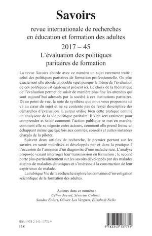 La revue Savoirs aborde dans ce numéro les politiques paritaires de formation professionnelles et leur évaluation. En effet, ce choix permet de saisir de manière plus fine les attendus aujourd'hui adressés par la société à ces institutions paritaires. Les deux articles de recherche portent respectivement sur les savoirs mobilisés concernant le diagnostic d'une maladie rare, et sur les savoirs développés par des malades atteints de maladies chroniques.