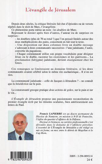 L'auteur s'intéresse aux doublets de Marc (épisodes ou versets répétés dans le récit de Marc) et met en évidence le fait que ces doublets (70 au total), loin de concerner uniquement la multiplication des pains, concernent en fait tout le texte et qu'une disposition en deux colonnes livre un double message s'adressant à deux communautés successives, l'une judaïsante, l'autre convertie du paganisme. L'évangile de Jérusalem propose une passionnante reconstitution du premier évangile, écrit bien antérieurement aux lettres de Paul.