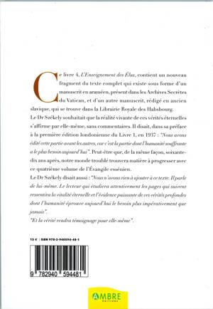 Ce Livre 4, « L'Enseignement des Élus », présente un nouveau fragment du texte complet qui existe sous forme d'un manuscrit en araméen, conservé dans les Archives Secrètes du Vatican. Le docteur Székely souhaitait que la réalité vivante de ces vérités éternelles s'affirme par elle-même, sans commentaires. Il déclarait, dans sa préface à la première édition londonienne du Livre 1, en 1937 : « Nous avons édité cette partie avant les autres, car c'est la partie dont l'humanité souffrante a le plus besoin aujourd'hui. » Peut-être, de la même façon, soixante-dix ans après, notre monde troublé trouvera-t-il matière à progresser avec ce quatrième volume de « L'Évangile essénien »…