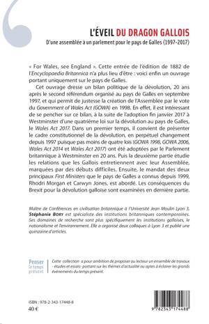 En mai 1997, le gouvernement travailliste de Tony Blair a été élu en faisant la promesse de créer une institution dévolue au Pays de Galles. Cet ouvrage dresse un bilan politique de la dévolution, 20 ans après le second référendum organisé au pays de Galles en septembre 1997, et qui permit de justesse la création de l'Assemblée par le vote du Government of Wales Act (GOWA) en 1998. L'auteure présente le cadre constitutionnel de la dévolution, en perpétuel changement depuis 1997, puis étudie les relations que les Gallois entretiennent avec leur Assemblée. Une dernière partie est consacrée aux conséquences du Brexit pour la dévolution galloise.