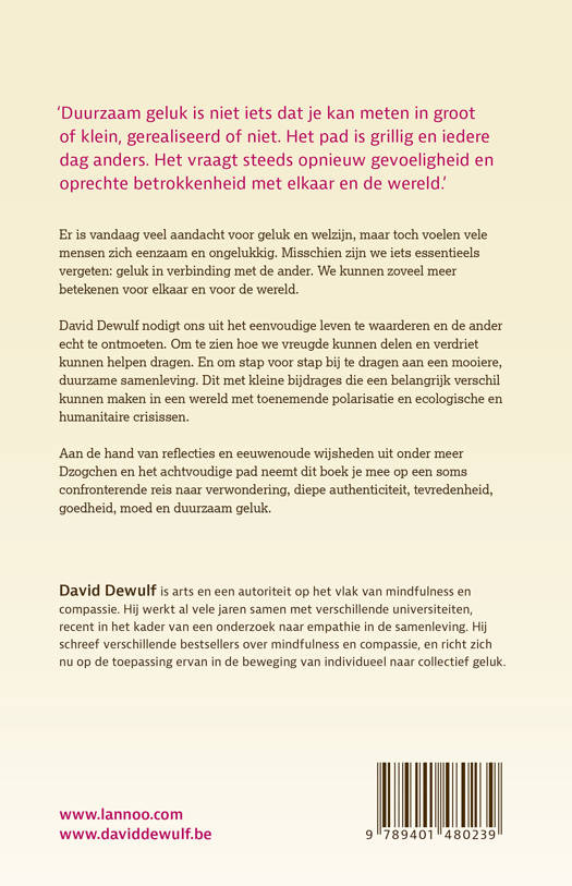 'Duurzaam geluk is niet iets dat je kan meten in groot of klein, gerealiseerd of niet. Het pad is grillig en iedere dag anders. Het vraagt steeds opnieuw gevoeligheid en oprechte betrokkenheid met elkaar en de wereld.'