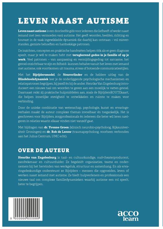 Ook als je niks hebt met autisme, kan deze gids je helpen inzicht te krijgen in terugkerend gedoe in je familie of op je werk. Leven naast autisme geeft houvast. Door de unieke combinatie van wetenschap, psychologie, kunst en ervaringsverhalen maakt Henrike van Engelenburg complexe thema’s invoelbaar én toegankelijk. Ze introduceert een nieuwe taal om moeilijk te vatten gevoelens en dynamieken te benoemen. Met het Bijrijdersmodel, de Neurovlinder en de Blindehoekdynamiek leer je de mechanismen achter herhalende vastlopende communicatie begrijpen. Praktische tools, zoals de BijrijdersROUTEkaart, helpen stevigheid te ontwikkelen en ruimte voor verbinding te creëren. Voor Bijrijders, zorgprofessionals én iedereen die beter wil leren navigeren in relaties die niet vanzelf gaan. Met bijdragen van dr. Yvonne Groen (klinisch neurobio-psycholoog, Rijksuniversiteit Groningen) en dr. Rob de Leeuw (traumapsycholoog, voorheen verbonden aan het Julius Centrum, UMC Utrecht).