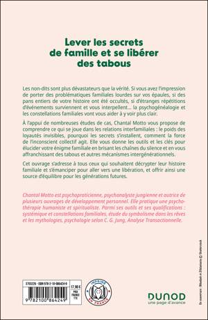 Les non-dits sont plus dévastateurs que la vérité. Si vous avez l’impression de porter des problématiques familiales lourdes sur vos épaules, si des pans entiers de votre histoire ont été occultés, si d’étranges répétitions d’événements surviennent et vous interpellent… la psychogénéalogie et les constellations familiales vont vous aider à y voir plus clair. À l’appui de nombreuses études de cas, Chantal Motto vous propose de comprendre ce qui se joue dans les relations interfamiliales : le poids des loyautés invisibles, pourquoi les secrets s’installent, comment la force de l’inconscient collectif agit. Elle vous donne les outils et les clés pour élucider votre énigme familiale en brisant les chaînes du silence et en vous affranchissant des tabous et autres mécanismes intergénérationnels. Cet ouvrage s’adresse à tous ceux qui souhaitent décrypter leur histoire familiale et s’émanciper pour aller vers une libération, et offrir ainsi une source d’équilibre pour les générations futures.