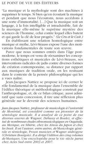 «Jean-Jacques Nattiez, professeur de musicologie à l'université de Montréal, est considéré comme un pionnier de la sémiologie musicale. Il a analysé de ce point de vue diverses oeuvres de Wagner, Debussy et Boulez, et effectué de nombreuses études ethnomusicologiques en Ouganda, au Mexique, en Sibérie, chez les Aïnou du Japon et chez les Inuit. Il est l'auteur, entre autres, de Musicologie générale et sémiologie, Proust musicien et Wagner androgyne (Christian Bourgois). Il a dirigé l'édition des cinq volumes de Musiques. Une encyclopédie pour le XXIe siècle parus chez Actes Sud entre 2003 et 2007.»