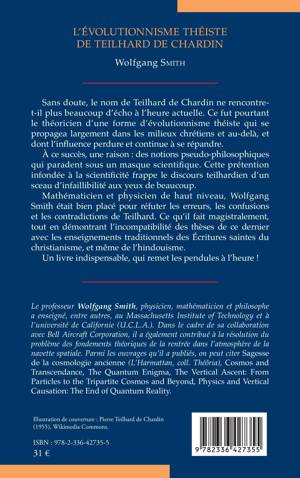 Sans doute, le nom de Teilhard de Chardin ne rencontre-t-il plus beaucoup d’écho à l’heure actuelle. Ce fut pourtant le théoricien d’une forme d’évolutionnisme théiste qui se propagea largement dans les milieux chrétiens et au-delà, et dont l’influence perdure et continue à se répandre.  À ce succès, une raison : des notions pseudo-philosophiques qui paradent sous un masque scientifique. Cette prétention infondée à la scientificité frappe le discours teilhardien d’un sceau d’infaillibilité aux yeux de beaucoup. Mathématicien et physicien de haut niveau, Wolfgang Smith était bien placé pour réfuter les erreurs, les confusions et les contradictions de Teilhard. Ce qu’il fait magistralement, tout en démontrant l’incompatibilité des thèses de ce dernier avec les enseignements traditionnels des Écritures saintes du christianisme, et même de l’hindouisme.