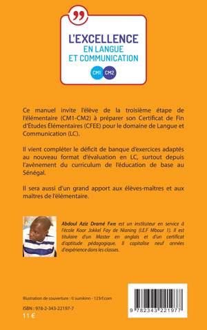 Ce manuel invite l'élève de la troisième étape de l'élémentaire (CM1-CM2) à préparer son Certificat de Fin d'Études Élémentaires (CFEE) pour le domaine de Langue et Communication (LC). Il vient compléter le déficit de banque d'exercices adaptés au nouveau format d'évaluation en LC, surtout depuis l'avènement du curriculum de l'éducation de base au Sénégal. Il sera aussi d'un grand apport aux élèves-maîtres et aux maîtres de l'élémentaire.