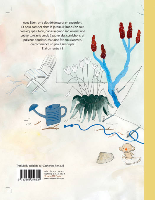 Avec Eden, on a décidé de partir en excursion. Et pour camper dans le jardin, il faut qu'on soit bien équipés. Alors, dans un grand sac, on met une couverture, une corde à sauter, des cornichons, et puis nos doudous. Mais une fois sous la tente, on commence un peu à s'ennuyer. Et si on rentrait ?