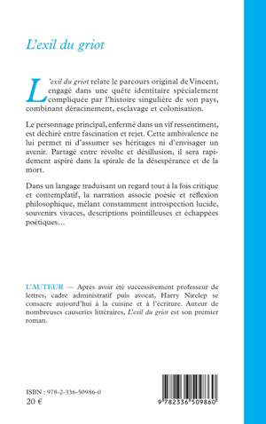L'exil du griot relate le parcours original de Vincent, engagé dans une quête identitaire spécialement compliquée par l'histoire singulière de son pays, combinant déracinement, esclavage et colonisation. Le personnage principal, enfermé dans un vif ressentiment, est déchiré entre fascination et rejet. Cette ambivalence ne lui permet ni d'assumer ses héritages ni d'envisager un avenir. Partagé entre révolte et désillusion, il sera rapidement aspiré dans la spirale de la désespérance et de la mort. Dans un langage traduisant un regard tout à la fois critique et contemplatif, la narration associe poésie et réflexion philosophique, mêlant constamment introspection lucide, souvenirs vivaces, descriptions pointilleuses et échappées poétiques...