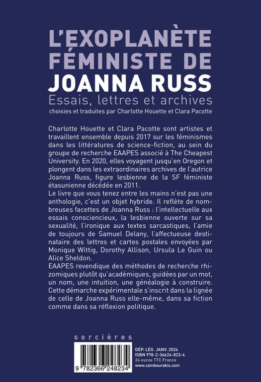Charlotte Houette et Clara Pacotte sont artistes et travaillent ensemble depuis 2017 sur les féminismes dans les littératures de science-fiction, au sein du groupe de recherche EAAPES associé à The Cheapest University. En 2020, elles voyagent jusqu'en Oregon et plongent dans les extraordinaires archives de l'autrice Joanna Russ, figure lesbienne de la SF féministe étasunienne décédée en 2011. Le livre que vous tenez entre les mains n'est pas une anthologie, c'est un objet hybride. Il reflète de nombreuses facettes de Joanna Russ : l'intellectuelle aux essais consciencieux, la lesbienne ouverte sur sa sexualité, l'ironique aux textes sarcastiques, l'amie de toujours de Samuel Delany, l'affectueuse destinataire des lettres et cartes postales envoyées par Monique Wittig, Dorothy Allison, Ursula Le Guin ou Alice Sheldon. EAAPES revendique des méthodes de recherche rhizomiques plutôt qu'académiques, guidées par un mot, un nom, une intuition, une généalogie à construire. Cette démarche expérimentale s'inscrit dans la lignée de celle de Joanna Russ elle-même, dans sa fiction comme dans sa réflexion politique.