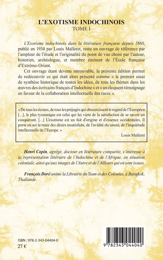 L'Exotisme indochinois dans la littérature française depuis 1860, publié en 1934 par Louis Malleret, reste un ouvrage de référence par l'ampleur de l'étude et l'originalité du point de vue choisi par l'auteur, historien, archéologue, et membre éminent de l'École française d'Extrême-Orient. Cet ouvrage est devenu introuvable, la présente édition alors présentée comme " le premier essai de synthèse historique de toutes les idées, de tous les thèmes dans les œuvres des écrivains français d'Indochine".