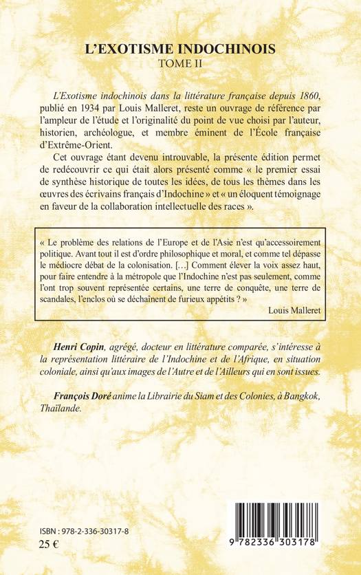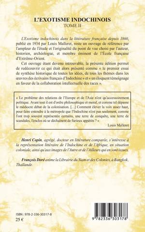 L'Exotisme indochinois dans la littérature française depuis 1860, publié en 1934 par Louis Malleret, reste un ouvrage de référence par l'ampleur de l'étude et l'originalité du point de vue choisi par l'auteur, historien, archéologue, et membre éminent de l'École française d'Extrême-Orient. Cet ouvrage est devenu introuvable, la présente édition alors présenté comme " le premier essai de synthèse historique de toutes les idées, de tous les thèmes dans les œuvres des écrivains français d'Indochine".