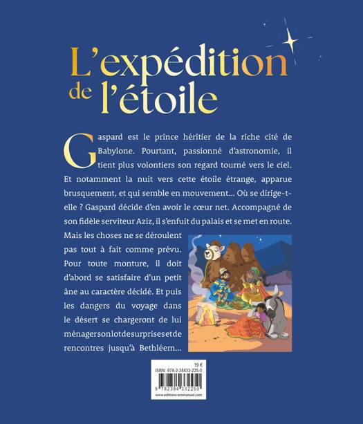 Le jeune prince de Babylone Gaspard vit dans son palais, sous la coupe de sa mère tyrannique. Sa seule passion ? Les étoiles. Ainsi, lorsqu'un nouvel astre se met à briller dans les cieux, Gaspard n'hésite pas et s'échappe, une nuit, en compagnie de son serviteur Aziz. Mais son expédition ne sera pas de tout repos : entre un âne têtu déterminé à s'échapper et des rencontres avec des rois de contrées lointaines, Gaspard réussira-t-il à comprendre ce qu'annonce cette mystérieuse étoile ? Illustrations d'Eléonore della Malva