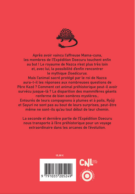 Après avoir vaincu l'affreuse Mama-cuna, les membres de l'Expédition Doecuru touchent enfin au but ! Le royaume de Nazca n'est plus très loin et, avec lui, la possibilité d'enfin rencontrer le mythique Doedicurus. Mais l'animal sacré protégé par le roi de Nazca aura-t-il les réponses aux nombreuses questions de Père Kazé ? Comment cet animal préhistorique peut-il avoir survécu jusque-là ? La disparition des mammifères géants renferme de bien sombres mystères... Entourés de leurs compagnons à plumes et à poils, Ryûji et Sayuri ne sont pas au bout de leurs surprises, peut-être même ne sont-ils qu'au tout début de leur chemin. La seconde et dernière partie de l'Expédition Doecuru nous transporte à l'ère préhistorique pour un voyage extraordinaire dans les arcanes de l'évolution.