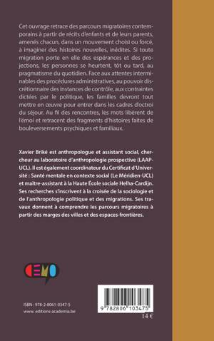 Cet ouvrage retrace des parcours migratoires contemporains à partir des récits des enfants et de leurs parents. Si toute migration porte en elle des espérances et des projections, les personnes se heurtent, tôt ou tard, aux attentes interminables des procédures administratives et aux contraintes dictées par le politique. Au fil des rencontres, les mots libèrent de l'émoi et retracent des fragments d'histoires faites de bouleversements psychiques et familiaux.