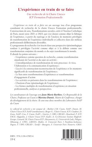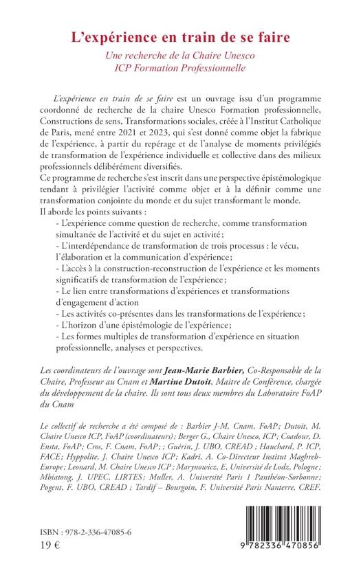 L'expérience en train de se faire est un ouvrage issu d'un programme coordonné de recherche de la chaire Unesco Formation professionnelle, Constructions de sens, Transformations sociales, créée à l'Institut Catholique de Paris, mené entre 2021 et 2023, qui s'est donné comme objet la fabrique de l'expérience, à partir du repérage et de l'analyse de moments privilégiés de transformation de l'expérience individuelle et collective dans des milieux professionnels délibérément diversifiés. Ce programme de recherche s'est inscrit dans une perspective épistémologique tendant à privilégier l'activité comme objet et à la définir comme une transformation conjointe du monde et du sujet transformant le monde. Il aborde les points suivants - L'expérience comme question de recherche, comme transformation simultanée de l'activité et du sujet en activité; - L'interdépendance de transformation de trois processus le vécu, l'élaboration et la communication d'expérience; - L'accès à la construction-reconstruction de l'expérience et les moments significatifs de transformation de l'expérience; - Le lien entre transformations d'expériences et transformations d'engagement d'action - Les activités co-présentes dans les transformations de l'expérience; - L'horizon d'une épistémologie de l'expérience; Les formes multiples de transformation d'expérience en situation professionnelle, analyses et perspectives.