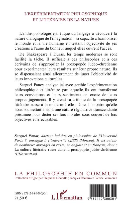 L'anthropobiologie esthétique du langage a découvert la nature dialogique de l'imagination: sa capacité à harmoniser le monde et la vie humaine en testant l'objectivité de ses créations à l'aune du bonheur auquel elles ouvrent l'accès. De Shakespeare à Duras, les temps modernes se sont facilité la tâche. Il suffisait à ces philosophes et à ces écrivains de s'approprier la prosopopée judéo-chrétienne pour expérimenter leurs résultats sur leur propre nature. Ils se dispensaient ainsi allègrement de juger l'objectivité de leurs innovations culturelles. Serguei Panov analyse ici avec acribie l'expérimentation philosophique et littéraire par laquelle ils ont transformé leurs convictions et leurs sentiments en ersatz de leurs propres jugements. Il y étend sa critique de la prosopopée littéraire russe à la modernité elle-même. Il montre qu'elle nous soumettait ainsi à une nature régulatrice transcendante présumée nous dicter ses lois morales sous couvert de lois objectives et irrécusables.