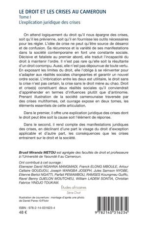 On attend logiquement du droit qu'il nous épargne des crises, soit qu'il les prévienne, soit qu'il en fournisse les outils nécessaires pour les régler. L'idée de crise ne peut qu'être source de désarroi et de confusion. Sa récurrence et la variété de ses manifestations dans la société contemporaine en font une constante sociale. Décisive et fataliste au premier abord, elle traduit l'incapacité du droit à maintenir l'ordre. Il n'est pas rare qu'elle soit la résultante d'un droit corrompu. En exposant les limites du droit, elle l'oblige à se réinventer pour s'adapter aux réalités sociales changeantes et garantir un nouvel ordre social. L'imbrication entre les deux est utilitaire, le droit sans la crise n'est pas certain, la crise sans le droit mène au chao. Prenant illustration de la société camerounaise traversée par des crises multiformes, cet ouvrage expose en deux tomes, les éléments essentiels de cette articulation. Dans le premier, il offre une explication juridique des crises dont le droit peut être soit la cause, soit l'élément de réponse. Dans le second, il rend compte des manifestations juridiques des crises, en déclinant d'une part le visage du droit d'exception applicable et d'autre part, les conséquences que les crises entrainent sur le droit et la société.