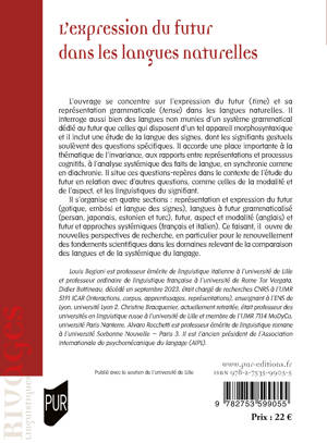 L’ouvrage se concentre sur l’expression du futur (time) et sa représentation grammaticale (tense) dans les langues naturelles. Il interroge aussi bien des langues non munies d’un système grammatical dédié au futur que celles qui disposent d’un tel appareil morphosyntaxique et il inclut une étude de la langue des signes, dont les signifiants gestuels soulèvent des questions spécifiques. Il accorde une place importante à la thématique de l’invariance, aux rapports entre représentations et processus cognitifs, à l’analyse systémique des faits de langue, en synchronie comme en diachronie. Il situe ces questions-repères dans le contexte de l’étude du futur en relation avec d’autres questions, comme celles de la modalité et de l’aspect, et les linguistiques du signifiant. Il s’organise en quatre sections : représentation et expression du futur (gotique, embosi et langue des signes), langues à futur grammaticalisé (persan, japonais, estonien et turc), futur, aspect et modalité (anglais) et futur et approches systémiques (français et italien). Ce faisant, il ouvre de nouvelles perspectives de recherche, en particulier pour le renouvellement des fondements scientifiques dans les domaines relevant de la comparaison des langues et de la systémique du langage.