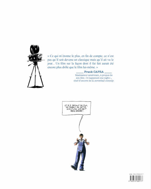« Ce qui m'étonne le plus, en fin de compte, ce n'est pas qu'il soit devenu un classique, mais qu'il ait vu le jour. Un film sur la façon dont il fut fait aurait été encore plus drôle que le film lui-même ». Frank CAPRA. Et si au lieu d'un film, on en faisait une BD... Pour célébrer le 30ème anniversaire de la disparition du maître réalisateur américain, les éditions Filidalo plongent dans le Hollywood des années 30 pour une aventure savoureuse et mouvementée, librement inspirée de faits réels. Comment tirer son épingle du jeu lorsque l'on vous ignore à la table des grands ? Comment faire en sorte que les choses basculent d'un côté et non pas toujours de l'autre ? Eternelle énigme du succès... Certains fomenteraient manigances, coups en douce ou savants stratagèmes, mais ici rien de tout cela... Simplement le sel de la vie _incertain et improbable_ et l'amitié bondissante entre un réalisateur et son scénariste. Une « comédie/fable » à la Capra au parfum tout cinéma.... ACTION !