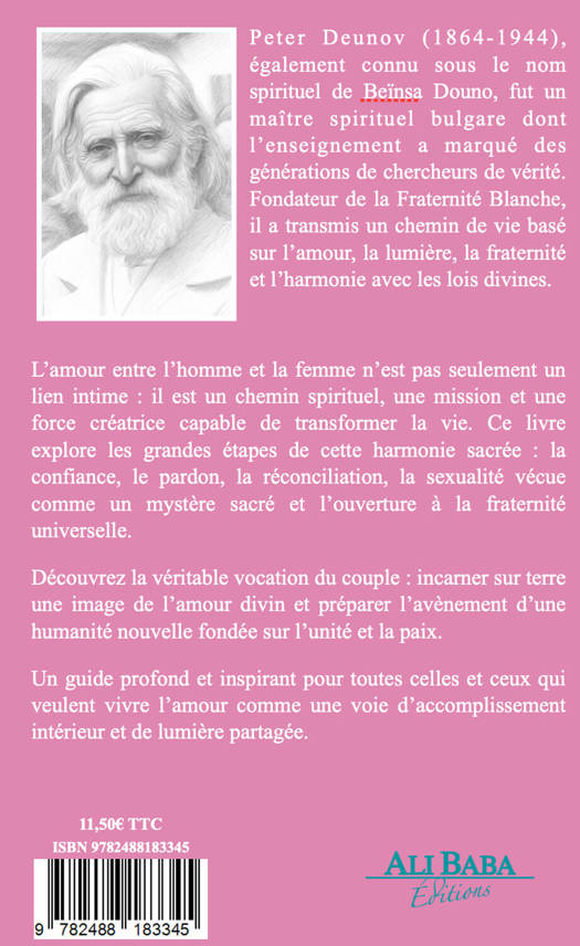 L'amour entre l'homme et la femme n'est pas seulement un lien intime: il est un chemin spirituel, une mission et une force créatrice capable de transformer la vie. Inspiré des enseignements lumineux de Peter Deunov, ce livre explore les grandes étapes de cette harmonie sacrée: la confiance, le pardon, la réconciliation, la sexualité vécue comme un mystère sacré et l'ouverture à la fraternité universelle. Chaque page invite à découvrir la véritable vocation du couple: incarner sur terre une image de l'amour divin et préparer l'avènement d'une humanité nouvelle fondée sur l'unité et la paix. Un guide profond et inspirant pour toutes celles et ceux qui veulent vivre l'amour comme une voie d'accomplissement intérieur et de lumière partagée.