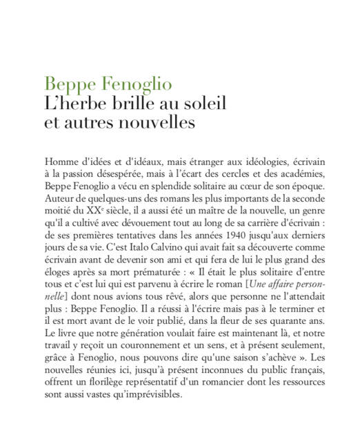 Homme d'idées et d'idéaux, Beppe Fenoglio a vécu en splendide solitaire au coeur de son époque, écrivant - comme il l'a lui-même affirmé - par nécessité morale, « avec une méfiance profonde et une confiance plus profonde encore ». Auteur de quelques-uns des romans les plus importants de la seconde moitié du XXe siècle, pas seulement de la littérature italienne, il a aussi été un maître de la nouvelle, un genre qu'il a cultivé avec dévouement tout au long de sa carrière d'écrivain. Italo Calvino fera de lui le plus grand des éloges après sa mort prématurée : « Il était le plus solitaire d'entre tous et c'est lui qui est parvenu à écrire le roman [Une affaire personnelle] dont nous avions tous rêvé, alors que personne ne l'attendait plus : Beppe Fenoglio ». Les nouvelles réunies ici, jusqu'à présent inconnues du public français, offrent un florilège représentatif d'un romancier dont les ressources sont aussi vastes qu'imprévisibles.