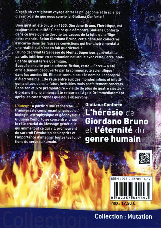 C'est à un vertigineux voyage entre la philosophie et la science d'avant-garde que nous convie ici Giuliana Conforto ! Bien qu'il ait été brûlé en 1600, Giordano Bruno, l'hérétique, est toujours d'actualité ! C'est ce que démontre Giuliana Conforto dans ce livre où elle dévoile les causes de la folie qui afflige notre monde. Selon elle, cette déraison collective s'incarne dans les fausses convictions qui lient notre mental à une réalité qui n'est en fait que virtuelle. Giordano Bruno exprimait la Sagesse du Mental Supérieur et révélait le paradis intérieur en communion naturelle avec cette Force intelligente qu'est la Vie Cosmique. Évoquée ensuite par la science-fiction, cette Force a été officiellement découverte par la science dans les années 1980. Elle est connue sous le nom peu approprié d' “électrofaible”. Cette Force relie entre eux des mondes infinis et intelligents situés dans le futur, invisibles mais concrets pour tous ceux qui sentent et aiment la liberté. Notre Mental Supérieur est en train de s'éveiller et prend conscience que la mort n'est rien de plus que “se dévêtir d'un costume de scène”. Dans son œuvre, vieille de plus de quatre siècles, Giordano Bruno annonçait le retour de l'Âge d'Or immédiatement après les catastrophes que nous observons.