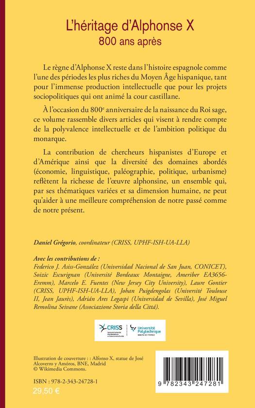 Le règne d’Alphonse X reste dans l’histoire espagnole comme l’une des périodes les plus riches du Moyen Âge hispanique, tant pour l’immense production intellectuelle que pour les projets sociopolitiques qui ont animé la cour castillane. À l’occasion du 800e anniversaire de la naissance du Roi sage, ce volume rassemble divers articles qui visent à rendre compte de la polyvalence intellectuelle et de l’ambition politique du monarque. La contribution de chercheurs hispanistes d’Europe et d’Amérique ainsi que la diversité des domaines abordés (économie, linguistique, paléographie, politique, urbanisme) reflètent la richesse de l’œuvre alphonsine, un ensemble qui, par ses thématiques variées et sa dimension humaine, ne peut qu’aider à une meilleure compréhension de notre passé comme de notre présent.